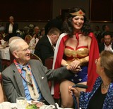 [had to swipe this pic off the BATCC site from last year's event...okay, she IS kissing Superman, but certainly Wonder Woman had her kisses, too! ] We started to tour the displays before sitting down to a delicious dinner, but never really got to see everything because we kept meeting interesting and entertaining people! There were speakers, incredible raffles, a silent auction, a Happy 70th Birthday to Wonder Woman, and plenty of comraderie and good humor - altogether, a perfect night! Thank you, BATCC! |
